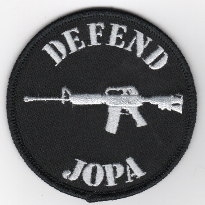 The mission of the “EASYRIDERS” is to provide highly trained, combat-ready LAMPS detachments to the ships of the Pacific Fleet Surface Force. This version says “DEFEND” along the top, JOPA (Junior Officer Protection Agency) along the bottom, with an AR-15 (for self-defense). This patch does not have velcro.