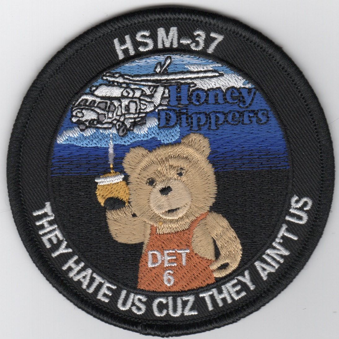 HSL-37 was established on 3 July, 1975 aboard Naval Air Station, Barbers Point, Hawaii, as the third operational Light Airborne Multi-Purpose System (LAMPS) squadron in the Pacific Fleet. On 6 February 1992, HSL-37 became the first and only US Navy helicopter squadron to transition from the SH-2F “Seasprite” LAMPS MK I to the SH-60B “Seahawk” LAMPS MK III. HSL-37 operated as a composite LAMPS MK I/MK III squadron until 1 October 1993, at which time it completed the transition to the SH-60B. The mission of the “EASYRIDERS” is to provide highly trained, combat-ready LAMPS detachments to the ships of the Pacific Fleet Surface Force. This is the deployment patch created for DET-6 and says “HONEY DIPPERS” (top) and “THEY HATE US CUZ THEY AIN’T US” (bottom).