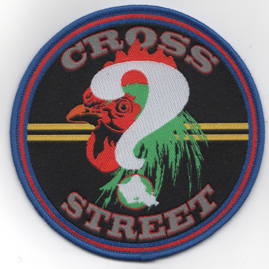 HSL/M-37 history is listed above. This is one of the detachment patches for HSM-37 that says “CROSS” (top), “STREET” (bottom), shows a rooster head with a white question mark, but in the bottom of the question mark, there is a image of a country where they deployed. I don’t recognize it, nor have a lot of info on this patch, so if you know more about this patch, please let me know. It does not come with velcro attached.