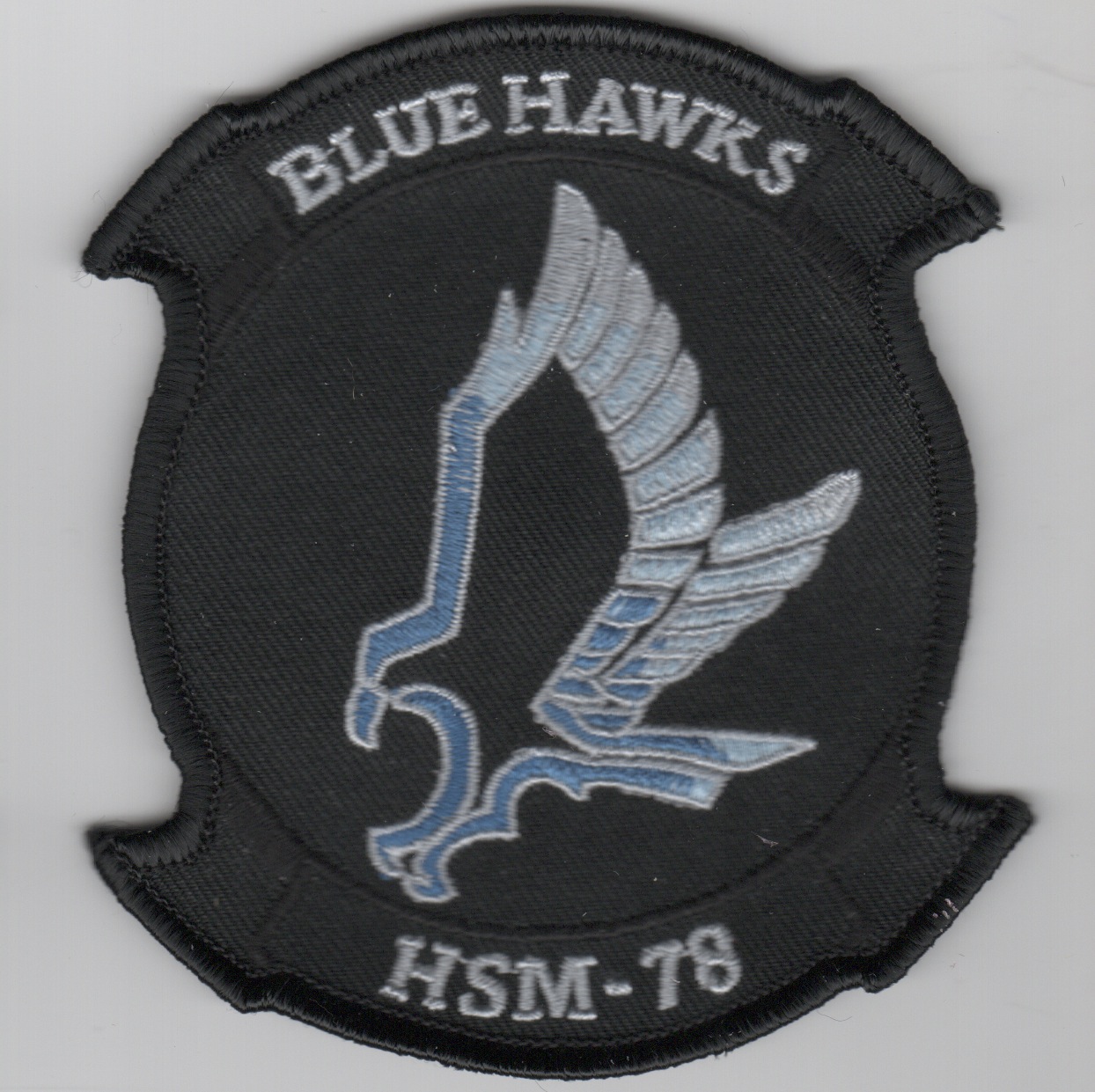 This is the black version of the squadron patch for the HSM-78 “Blue Hawks”. Helicopter Martime Strike Squadron SEVEN EIGHT (HSM-78) was established on 01 March 2012 at NAS North Island, CA as the Navy’s newest MH-60R squadron.Ê HSM-78 is currently assigned to Carrier Air Wing TWO (CVW-2) and is attached to the USS Carl Vinson (CVN-70). The Blue Hawks name dates back to the 1960’s and 1970’s when Helicopter Attack Light (HAL) squadrons served honorably during the Vietnam Conflict.Ê As the newest Helicopter Maritime Strike Squadron, the men and women of HSM-78 are eager to grow the legend and continue the proud heritage of those that went before us. This patch does not come with velcro attached.