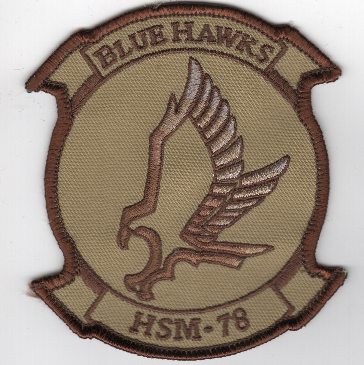 This is the desert version of the squadron patch for the HSM-78 “Blue Hawks”. Helicopter Martime Strike Squadron SEVEN EIGHT (HSM-78) was established on 01 March 2012 at NAS North Island, CA as the Navy’s newest MH-60R squadron.Ê HSM-78 is currently assigned to Carrier Air Wing TWO (CVW-2) and is attached to the USS Carl Vinson (CVN-70). The Blue Hawks name dates back to the 1960’s and 1970’s when Helicopter Attack Light (HAL) squadrons served honorably during the Vietnam Conflict.Ê As the newest Helicopter Maritime Strike Squadron, the men and women of HSM-78 are eager to grow the legend and continue the proud heritage of those that went before us. This patch does not come with velcro attached.