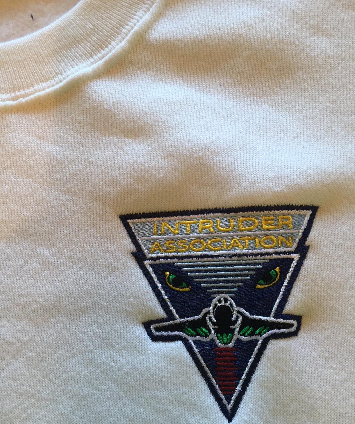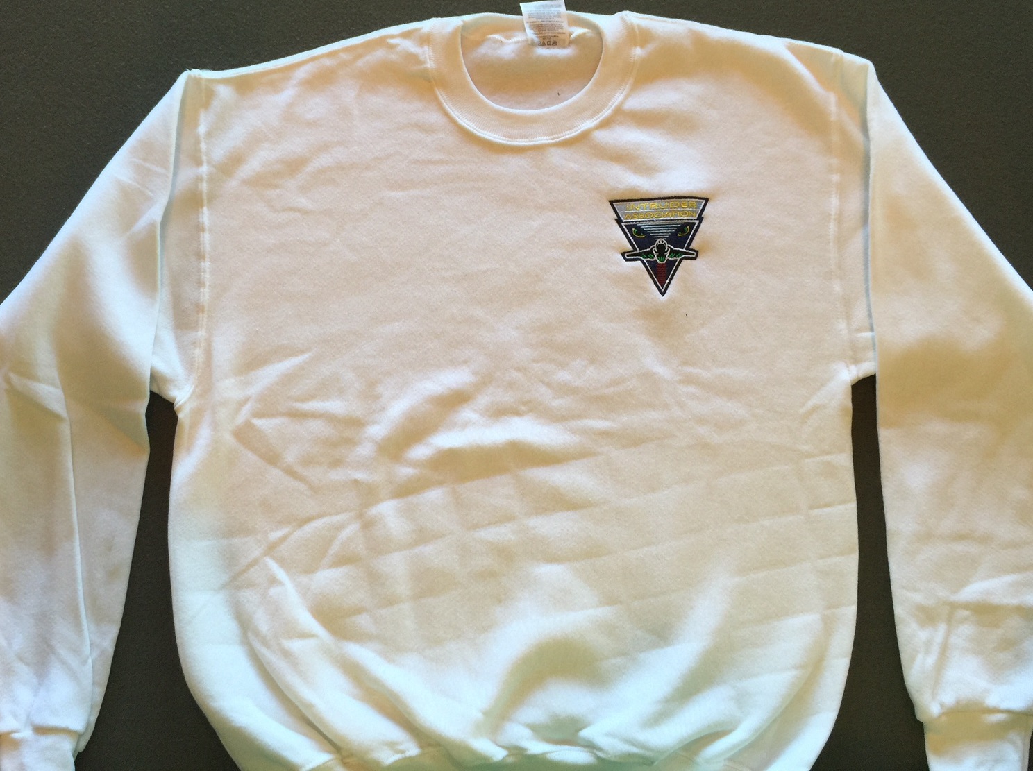 This is the white sweatshirt that has the “”””LOGO”””” of the Intruder Association embroidered directly onto the front left breast!! A closeup of the logo is shown below……