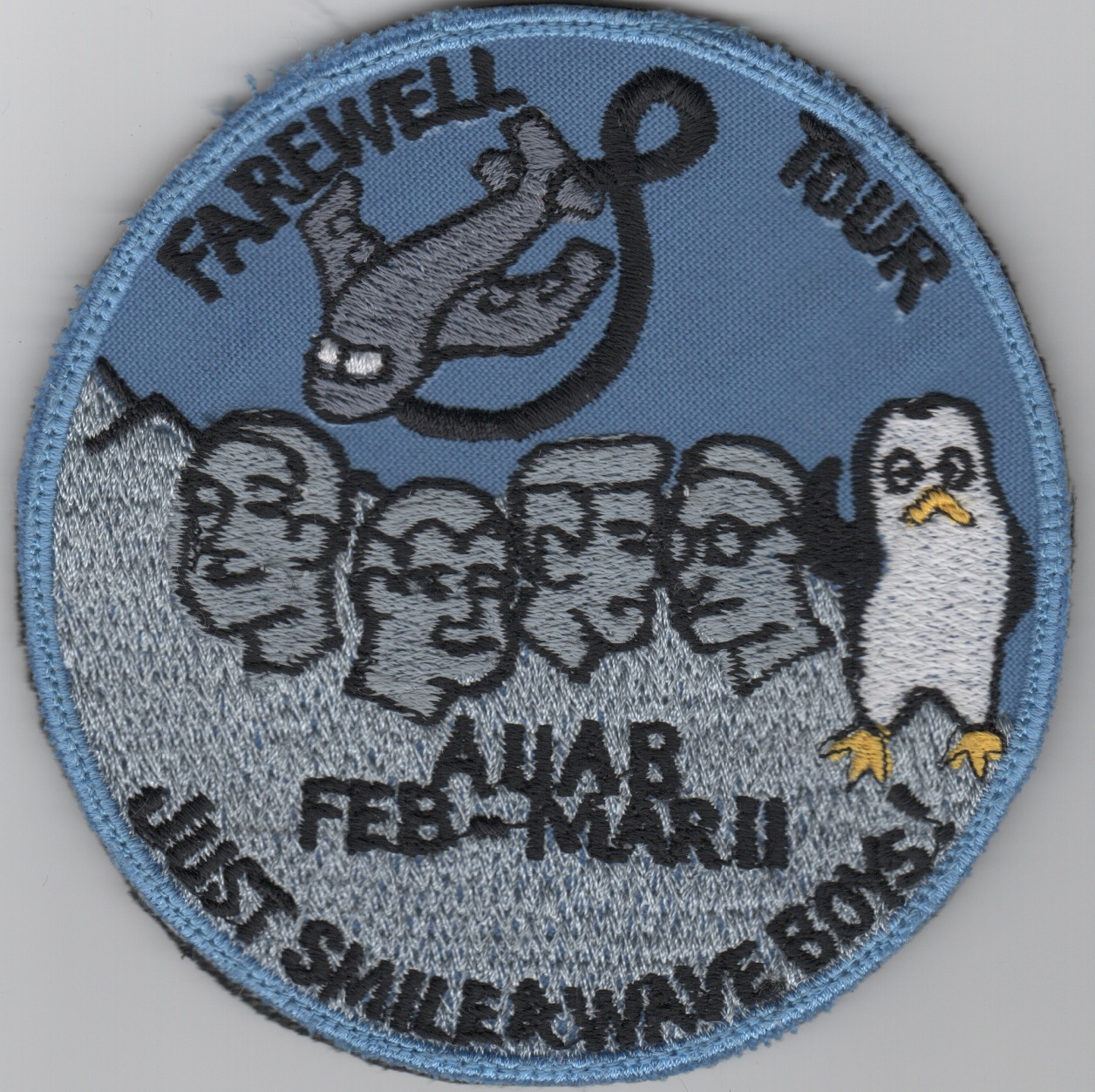 This is a handmade blue version of the crew patch from the 7EACCS JSTARS Crew 8 which is the deployed squadron from the 116th Air Control Wing and the 128th ACCS out of Robins AFB, GA. This patch was made locally at their deployed location. It shows the “Penguin” (the guys in the back running the mission) waving goodbye and states “Farewell Tour” as a 5th member of Mt. Rushmore.