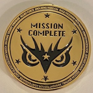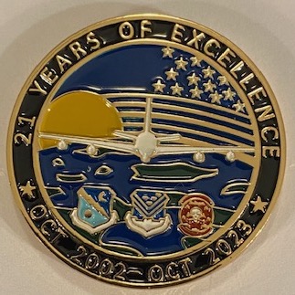 This is the front of the “challenge coin” created to commemorate the DECOMMISSIONING of the JOINT STARS Surveillance aircraft. It says *21 YEARS OF EXCELLENCE* (top), *OCT 2002 – OCT 2023* (bottom), and shows the COMMAND logos, t he aircraft, and the setting sun. You can see the back of the coin below.