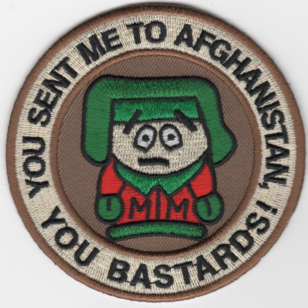 This patch was created recently to commemorate the “”””Show of Force/Power Projection”””” that the US Military demonstrated when the terrorist leaders/ISIS started “”””acting up”””” in that region. It shows the TV Show character “”””Kenny”””” from South Park saying “”””YOU SENT ME TO AFGHANISTAN”””” (along the top) and “”””YOU BASTARDS”””” along the bottom. This patch does not have velcro.
