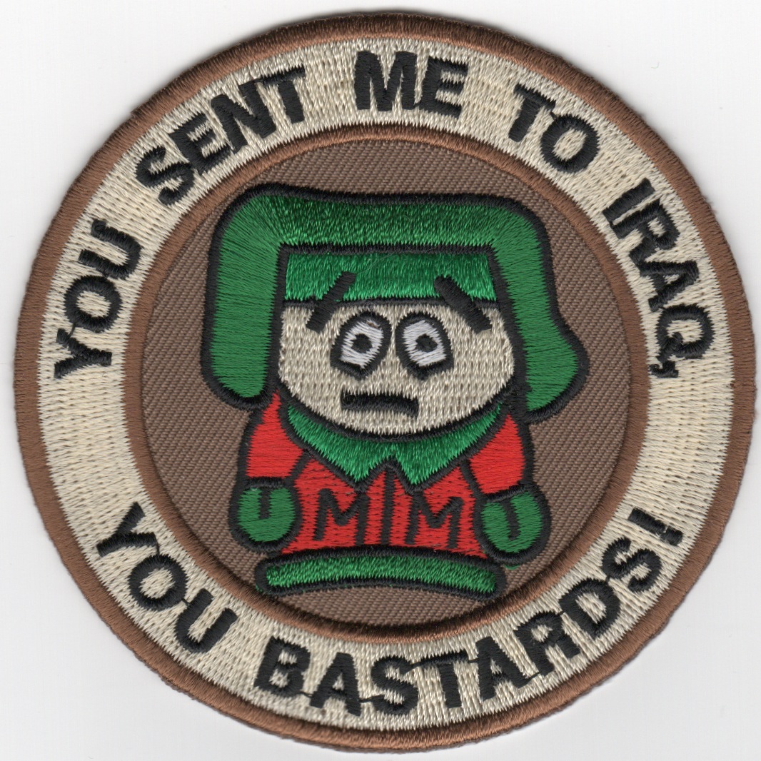 This patch was created recently to commemorate the “”””Show of Force/Power Projection”””” that the US Military demonstrated when the terrorist leaders/ISIS started “”””acting up”””” in that region. It shows the TV Show character “”””Kenny”””” from South Park saying “”””YOU SENT ME TO IRAQ”””” (along the top) and “”””YOU BASTARDS”””” along the bottom. This patch does not have velcro.