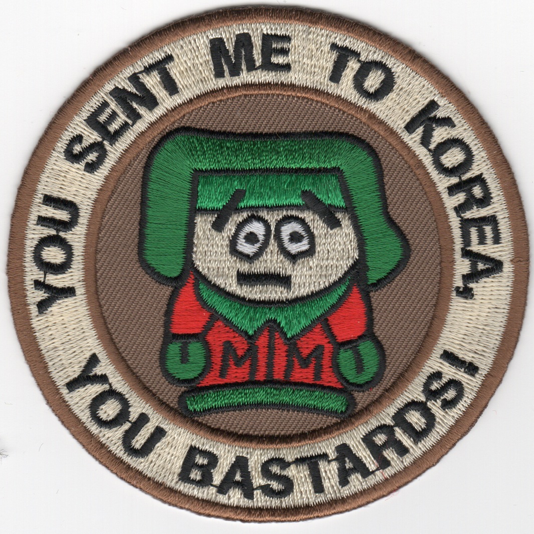 This patch was created recently to commemorate the “”””Show of Force/Power Projection”””” that the US Military demonstrated when the North Korean leader started “”””acting up”””” in that region. It shows the TV Show character “”””Kenny”””” from South Park saying “”””YOU SENT ME TO KOREA”””” (along the top) and “”””YOU BASTARDS”””” along the bottom. This patch does not have velcro.