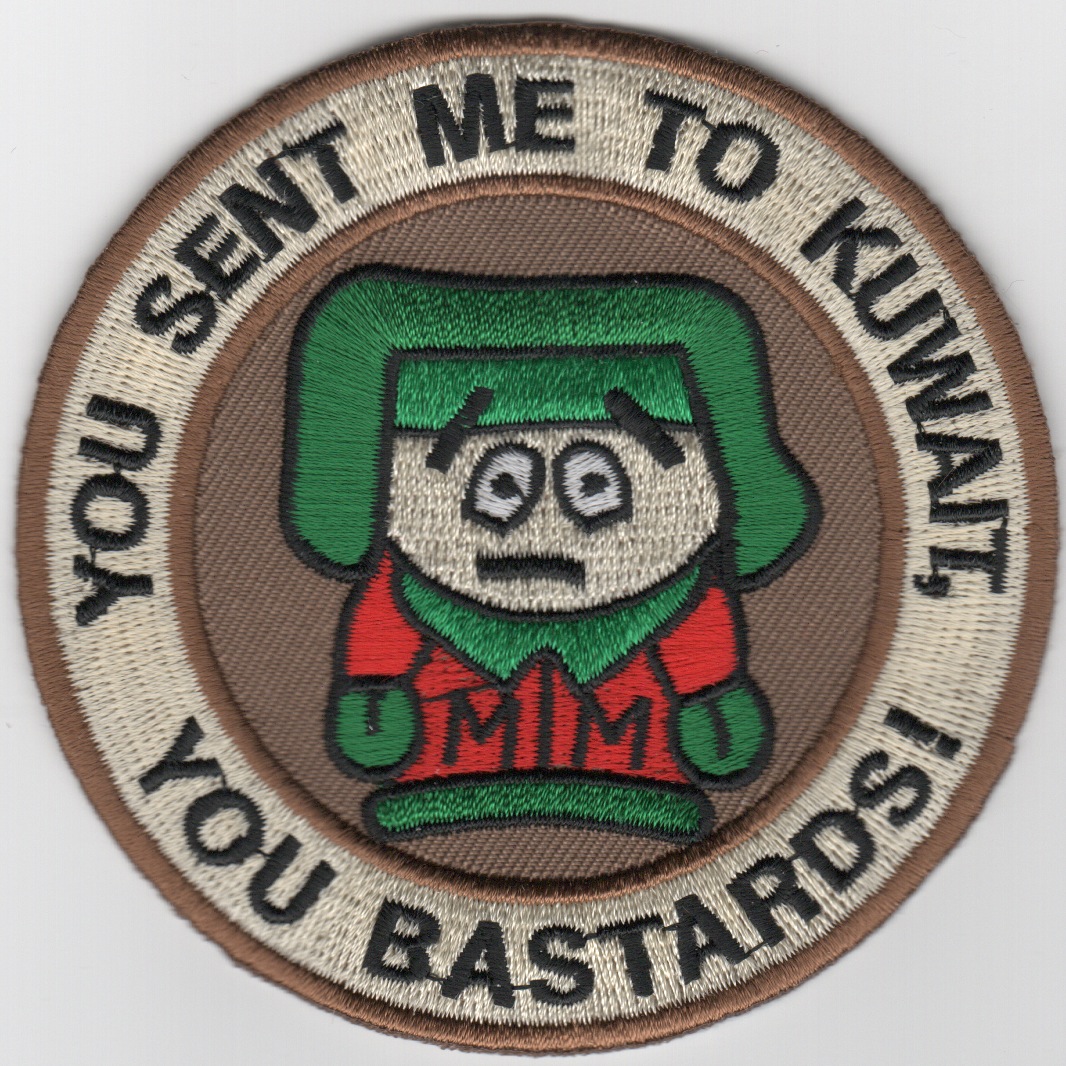 This patch was created recently to commemorate the “”””Show of Force/Power Projection”””” that the US Military demonstrated when the terrorist leaders/ISIS started “”””acting up”””” in that region. It shows the TV Show character “”””Kenny”””” from South Park saying “”””YOU SENT ME TO KUWAIT”””” (along the top) and “”””YOU BASTARDS”””” along the bottom. This patch does not have velcro.