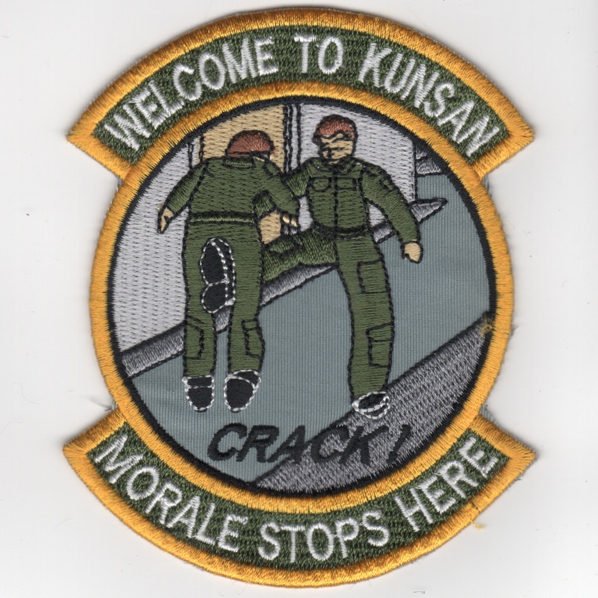 This is the KUNSAN AFB morale patch. It shows one military member giving an “”””attitude adjustment”””” to another and says “”””WELCOME TO KUNSAN”””” (top) and “”””MORALE STOPS HERE”””” (bottom). This patch does not come with velcro.