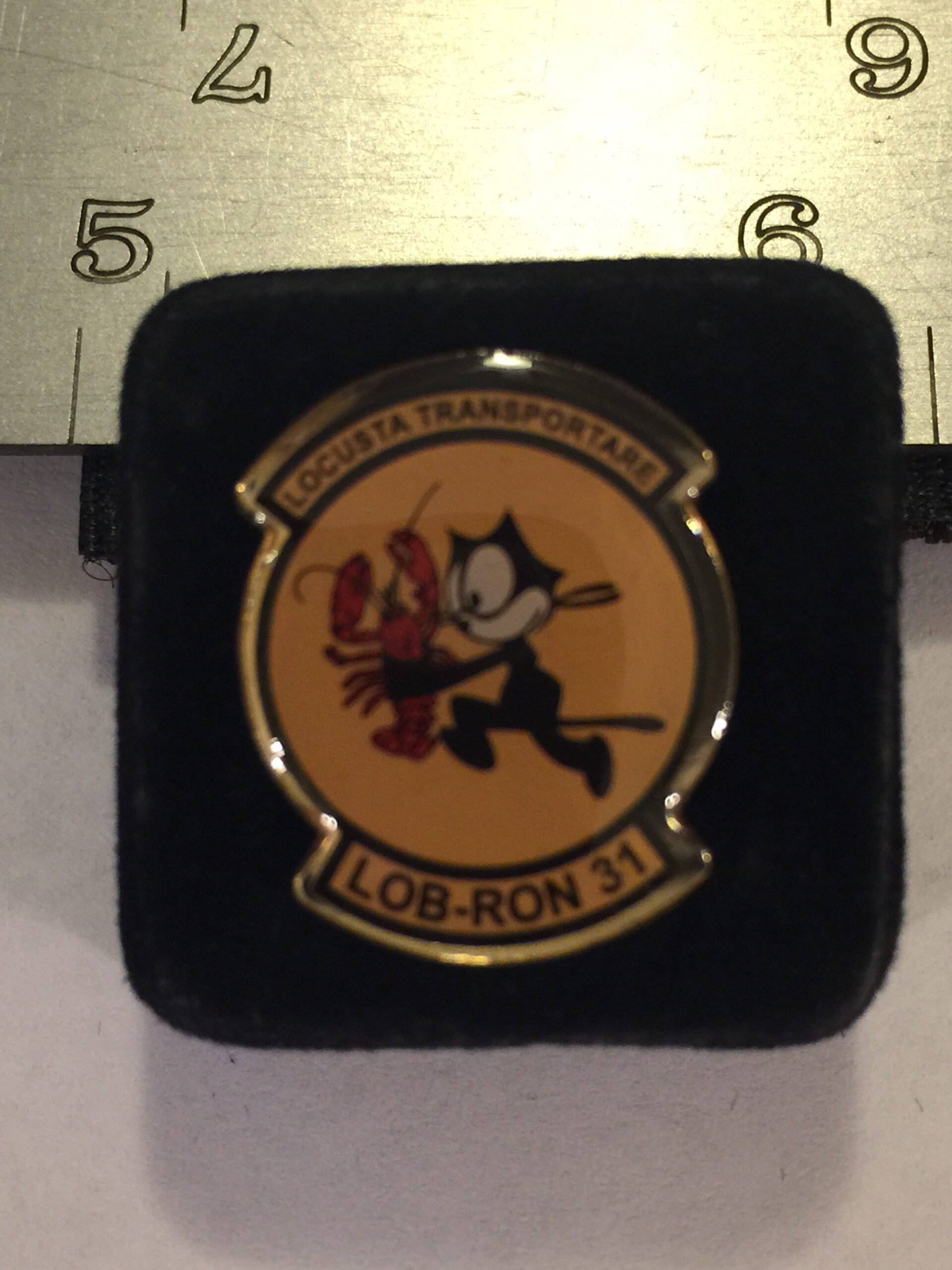 This is the Lapel Pin for VF-31 they created for their “Lobster Run”. It says “LOCUSTA TRANSPORTARE” across the top and “LOB-RON 31” along the bottom. Only have a few (7 initially), so they will probably go fast.