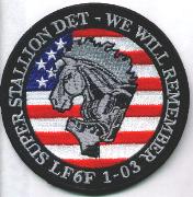 This is the medium sized Detachment patch for the USMC LF6F 1-03 Super Stallion Det patch. It states “”””WE WILL REMEMBER””””.