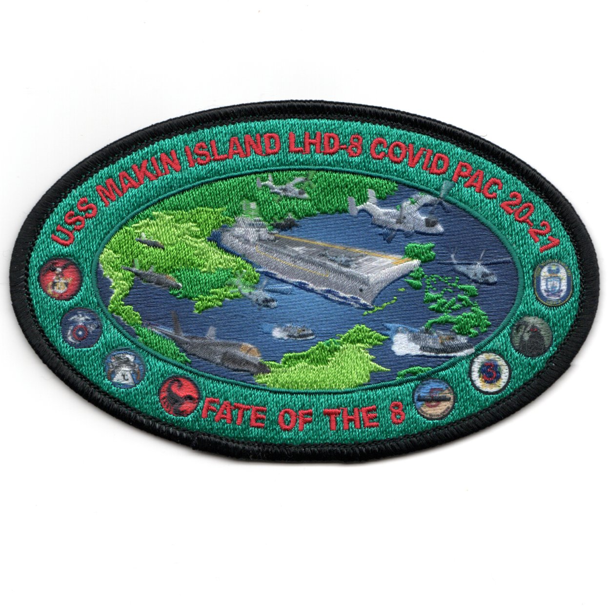 (Another AV*RSTUFF Creation): This is the deployment patch created for USS MAKIN ISLAND (LHD-8) 20-21 ‘COVID’ Cruise. It says ‘FATE OF THE 8’ (bottom) and has the unit insignia from all the attached squadrons. This patch does not come with velcro attached.