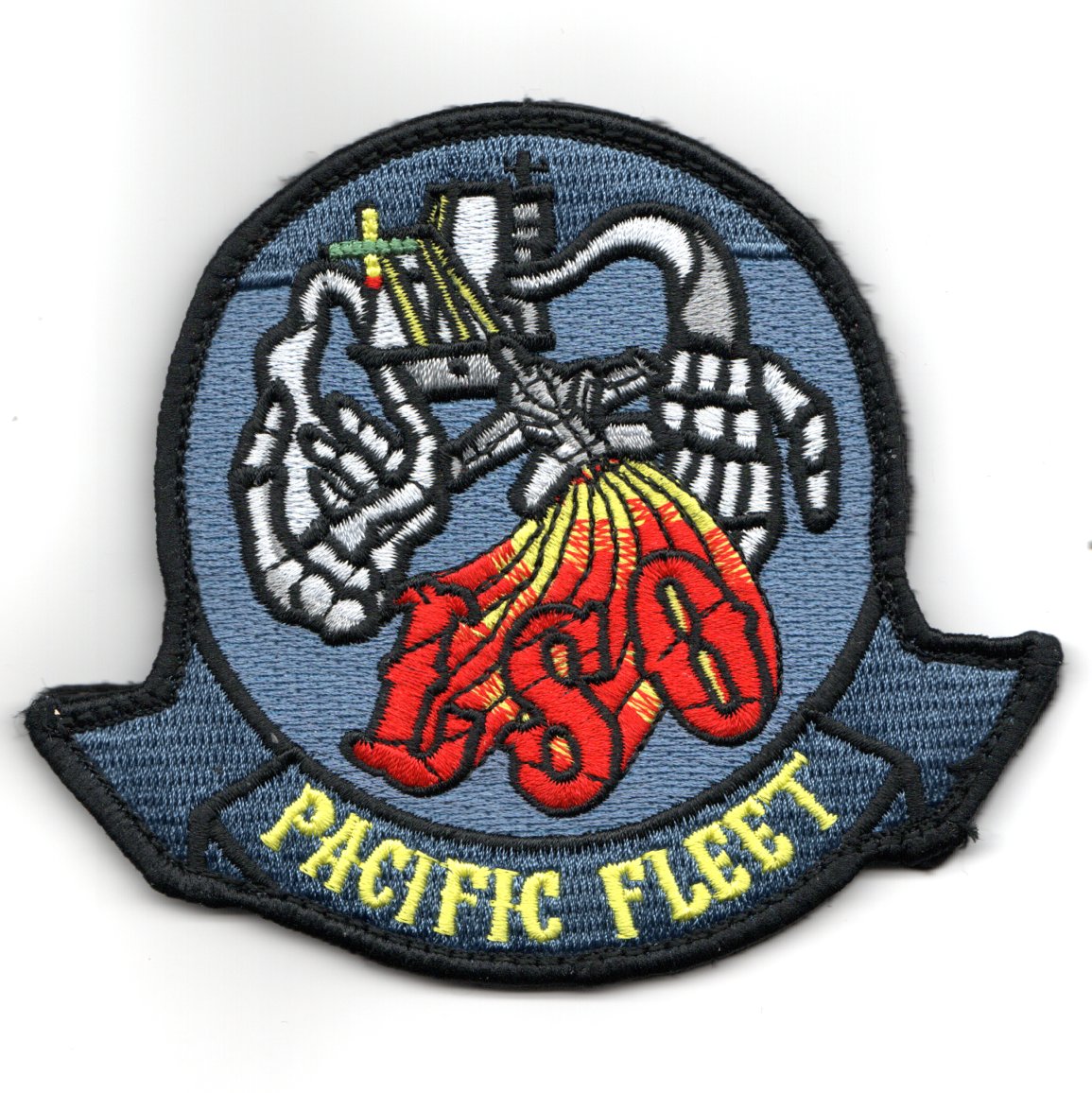 (Another AV8RSTUFF Creation): A landing signal officer or landing safety officer (LSO), also informally known as “PADDLES” (United States Navy) or “BATSMEN” (Royal Navy), is a naval aviator specially trained to facilitate the “safe and expeditious recovery” of naval aircraft aboard aircraft carriers. Originally LSOs were responsible for bringing aircraft aboard ship using hand-operated signals. Since the introduction of optical landing systems in the 1950s, LSOs assist pilots by giving information via radio handsets. This patch was created for the LSO’s of the PACIFIC FLEET and show “skeletal hands” assisting an F/A-18 Hornet onto the deck and does come with velcro attached.