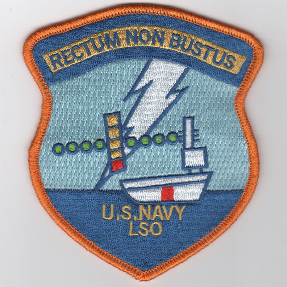 Another AV8RSTUFF Creation: Even though this is the previous style of the patch worn by the Landing Signal Officer school students located at NAS Oceana, VA, several wanted to show their “college spirit” by having this “old style” LSO patch made with their school color for the border. All LSOs come through this school before being certified for duty on the boat. This version is fully embroidered, does NOT have velcro, but DOES have the orange border for several of the colleges (Clemson, Florida, and one other, I believe)!!