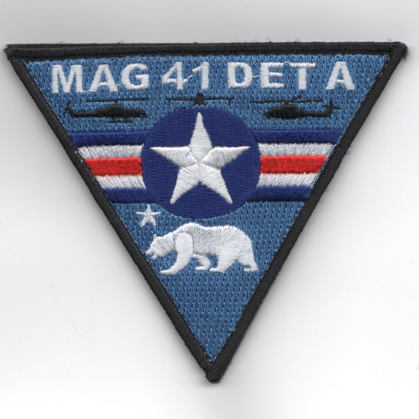 (Another AV8RSTUFF Production): This is the blue version of the triangular patch created for Marine Air Group 41 (MAG-41) Detachment A. Their mission is to train, man, equip, and sustain an expeditionary aviation combat element (ACE), Combined Forces Air Component Commander (CFACC) element, an aviation logistics squadron, a fighter-attack squadron, a fighter adversary squadron and an aerial refueler/assault support squadron in order to deploy/employ as a MAG/ACE, a special purpose Marine Air-Ground Task Force (MAGTF), or any combination of capabilities in support of MAGTF or Combined/Joint Warfare. DET-A is located at MCAS Camp Pendleton, CA and does come with velcro attached.