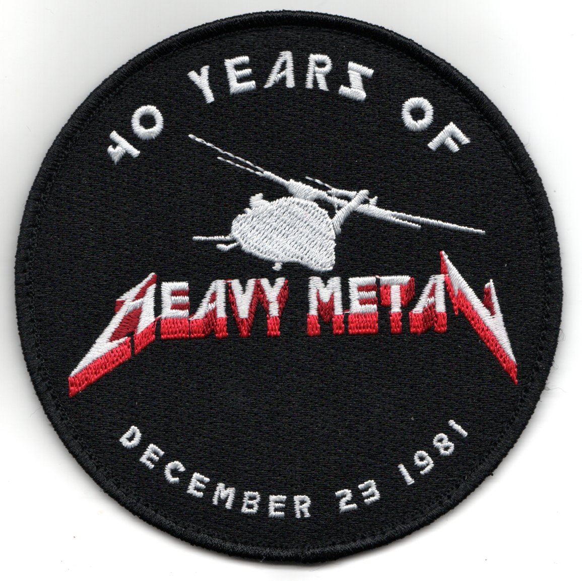 The Sikorsky MH-53 is a variant of the CH-53 except for a few particulars such as fuels and weights. It combines the power of the 3-engined CH-53E with the minesweeping capabilities of the RH-53D and enables it to drag heavier minehunting sleds through rougher seas. It also has upgraded adverse weather avionics allowing it to operate in the worst of conditions. This is the large, black, anniversary patch created that says “40 YEAR OF HEAVY METAL” and does come with velcro attached. The date at the bottom says DECEMBER 23 1981.