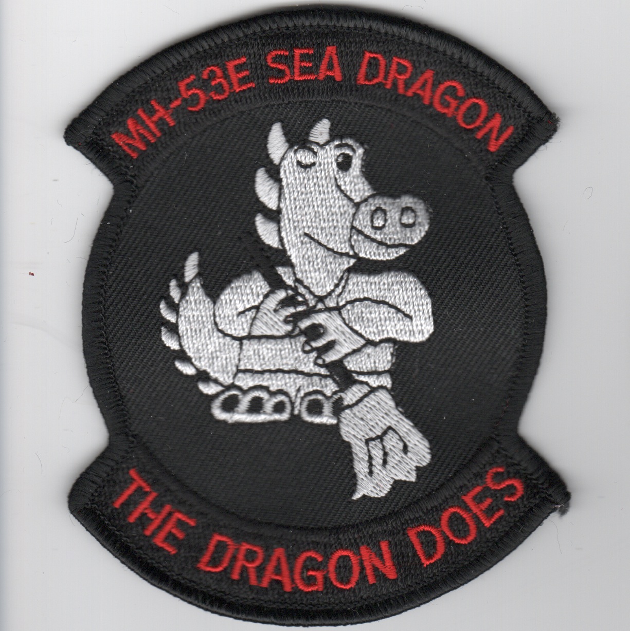 This is the black version of the aircraft patch for the MH-53E Super Stallion. It says “”””The Dragon Does”””” (bottom) and does not come with velcro attached.