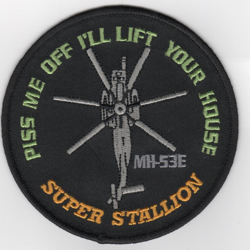 This patch depicts the MH-53E planform and says “PISS ME OFF I’LL LIFT YOUR HOUSE” across the top and “SUPER STALLION” along the bottom…..damn funny. This patch does not come with velcro attached.