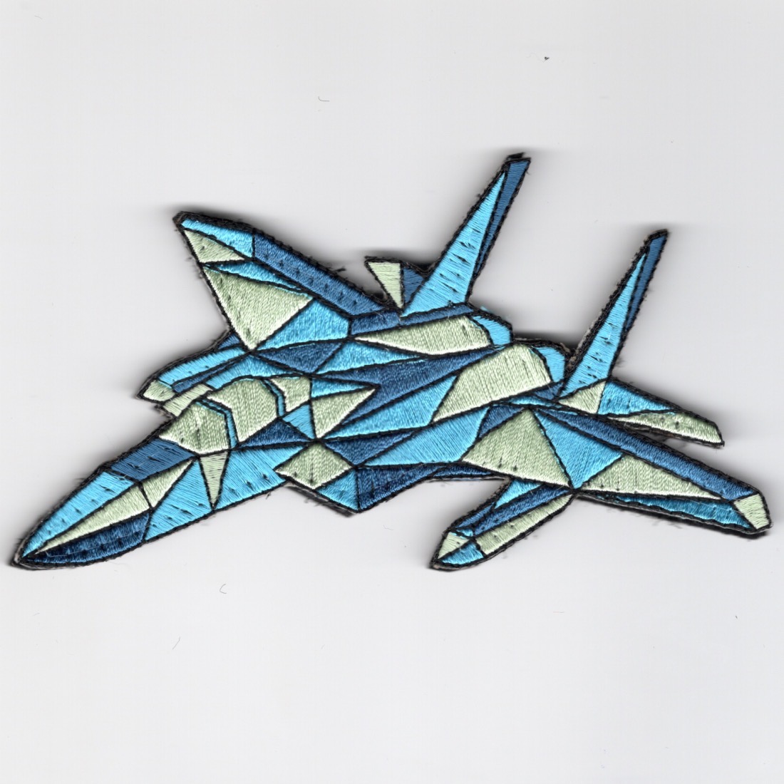 (Another AV8RSTUFF “fun” Creation): This is the *geometric-designed* F-15E Strike Eagle that has these colors: Light Blue/Dark Blue/Gray and does come with velcro attached….Why? Just for the hell of it!!!