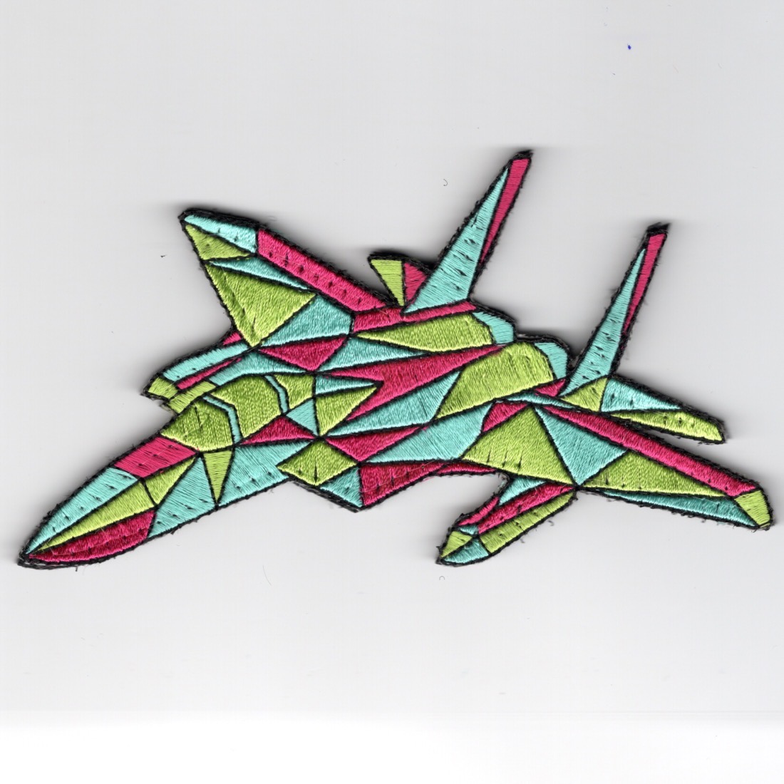 (Another AV8RSTUFF “fun” Creation): This is the *geometric-designed* F-15E Strike Eagle that has these colors: Pink/Light Blue/Light Green and does come with velcro attached….Why? Just for the hell of it!!!