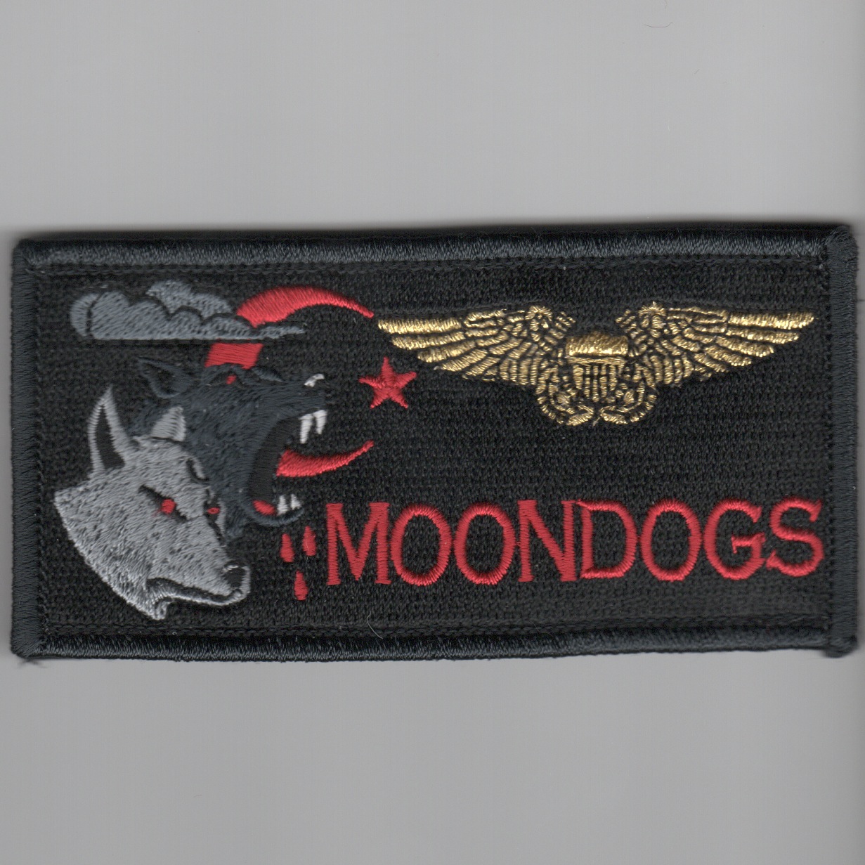 The Moondogs of VMAQ-3 deployed to Incirlik, Turkey in early 2017 in support of combat operations for Operation INHERENT RESOLVE in supporting the fight against DaÕesh. This black nametag with NFO wings with “MOONDOGS” pre-embroidered was created by AV8RSTUFF for their deployed wear and comes with velcro attached.