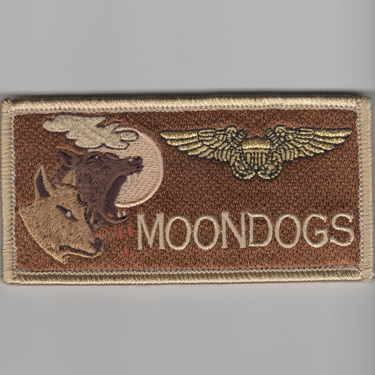 The Moondogs of VMAQ-3 deployed to Incirlik, Turkey in early 2017 in support of combat operations for Operation INHERENT RESOLVE in supporting the fight against DaÕesh. This ‘REGULAR’ desert nametag with NFO wings with “MOONDOGS” pre-embroidered is one of the two desert versions created by AV8RSTUFF for their “desert” flightsuits and comes with velcro attached.