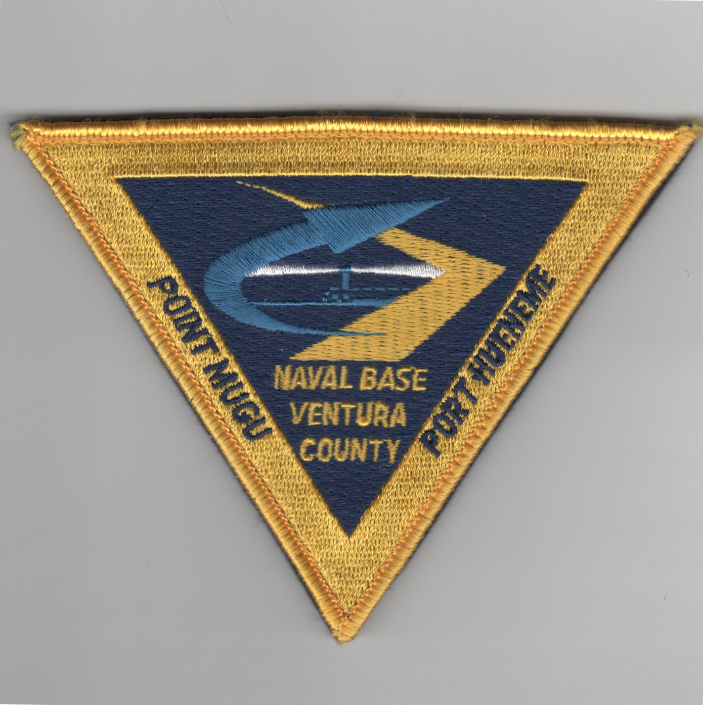 This is the triangular version of the base patch for the Naval Bases in Ventura County, CA…..Point Mugu and Port Hueneme. This patch DOES NOT come with velcro attached.
