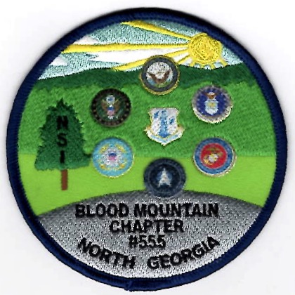 This is the chapter patch created by the North GA Chapter of the National Sojourners – The BLOOD MOUNTAIN CHAPTER #555. It depicts the seven different Service Branch logos, has NSI in the Tree, the Square and Compass in the Sun, and does not have velcro attached.