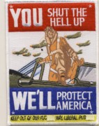 This is a replica type patch meant to look like the old WWII propaganda posters — with a twist. The patch shows a pilot getting out of his airplane. On the top it says “YOU Shut The Hell Up”. Below the pilot it says “WE’LL Protect America”. On the bottom in small letters it says “Keep Out Of Our Fuc&ing Way, Liberal Pu$$ies. I covered up the actual patch for the photo on the web-site, but rest assured, the patch you order WILL have the explicit words on it!!! Damn cool patch! This patch does not come with velcro attached.