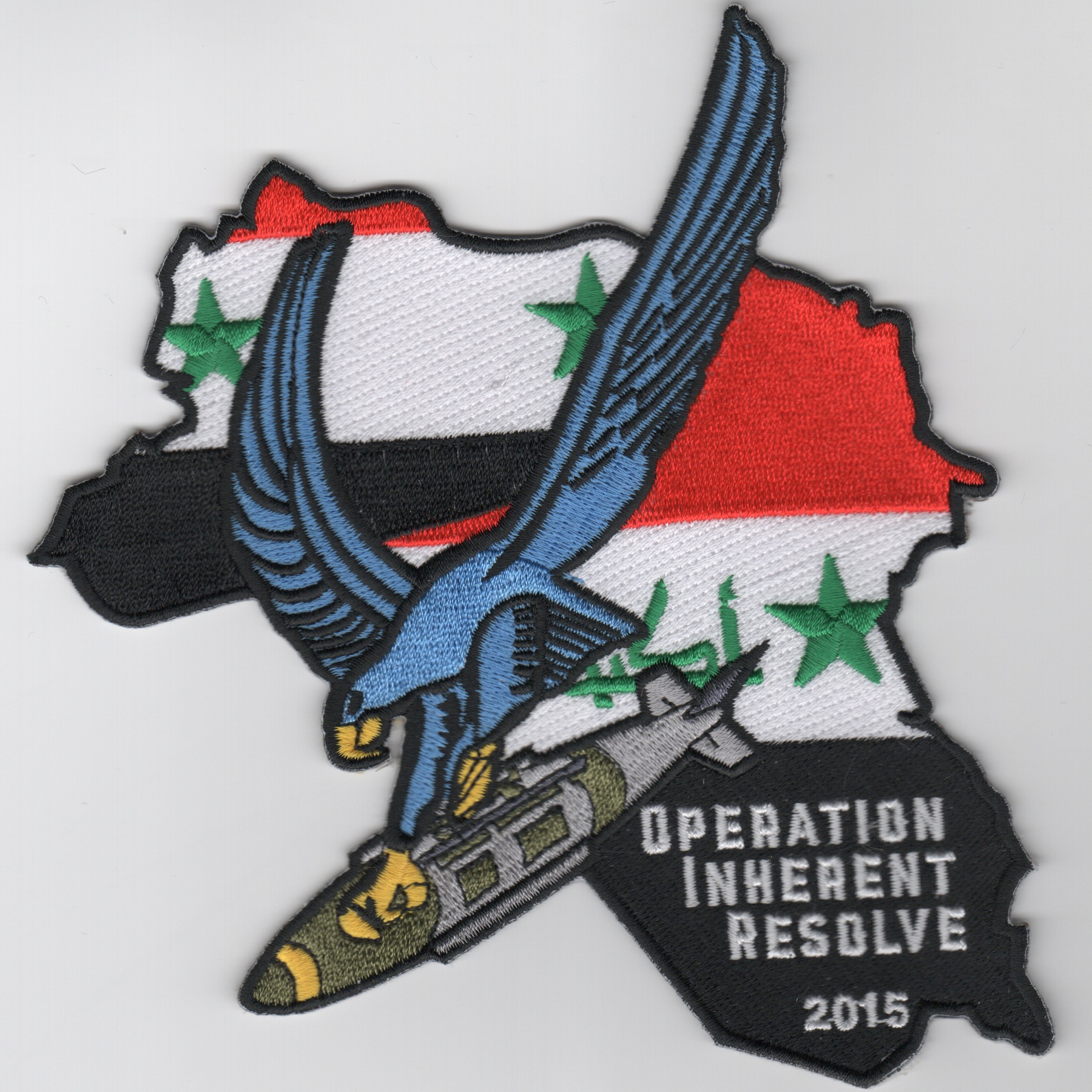 This is the 2015 version of the Operation Inherent Resolve patch created showing the country of Iraq with an Eagle carrying a JDAM. It’s a large patch and does not have velcro.