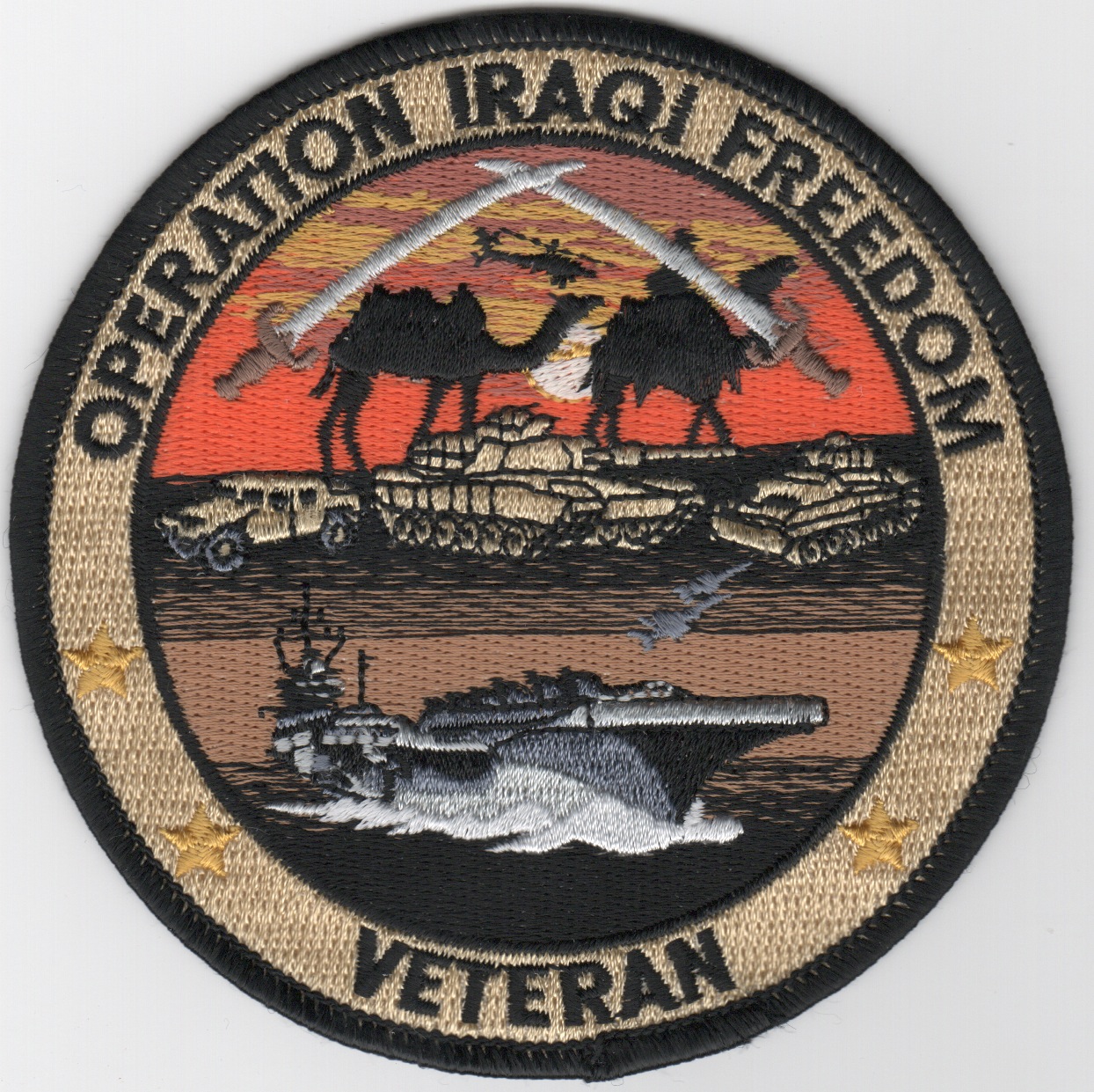 This is the round version of the OIF patch that shows the Army tanks on the top and the US Navy’s aircraft carrier on the bottom with the lettering “”””VETERAN”””” along the bottom.