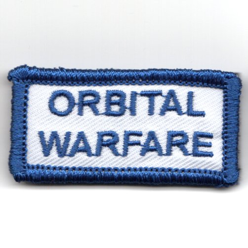 This is the blue-bordered/blue-letters/white-background version of the Pencil Pocket/Flight Suit Sleeve (FSS) that says “”””ORBITAL WARFARE”””” and is worn on the left sleeve of the flight suit. This patch DOES have velcro on it.