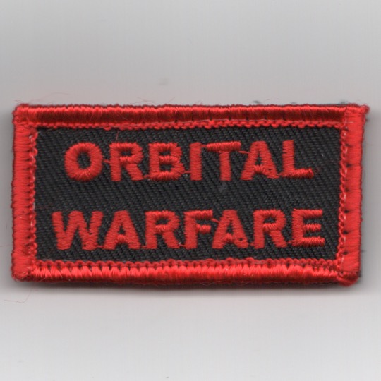 This is the red-bordered/red-letters/black-background version of the Pencil Pocket/Flight Suit Sleeve (FSS) that says “”””ORBITAL WARFARE”””” and is worn on the left sleeve of the flight suit. This patch DOES have velcro on it.