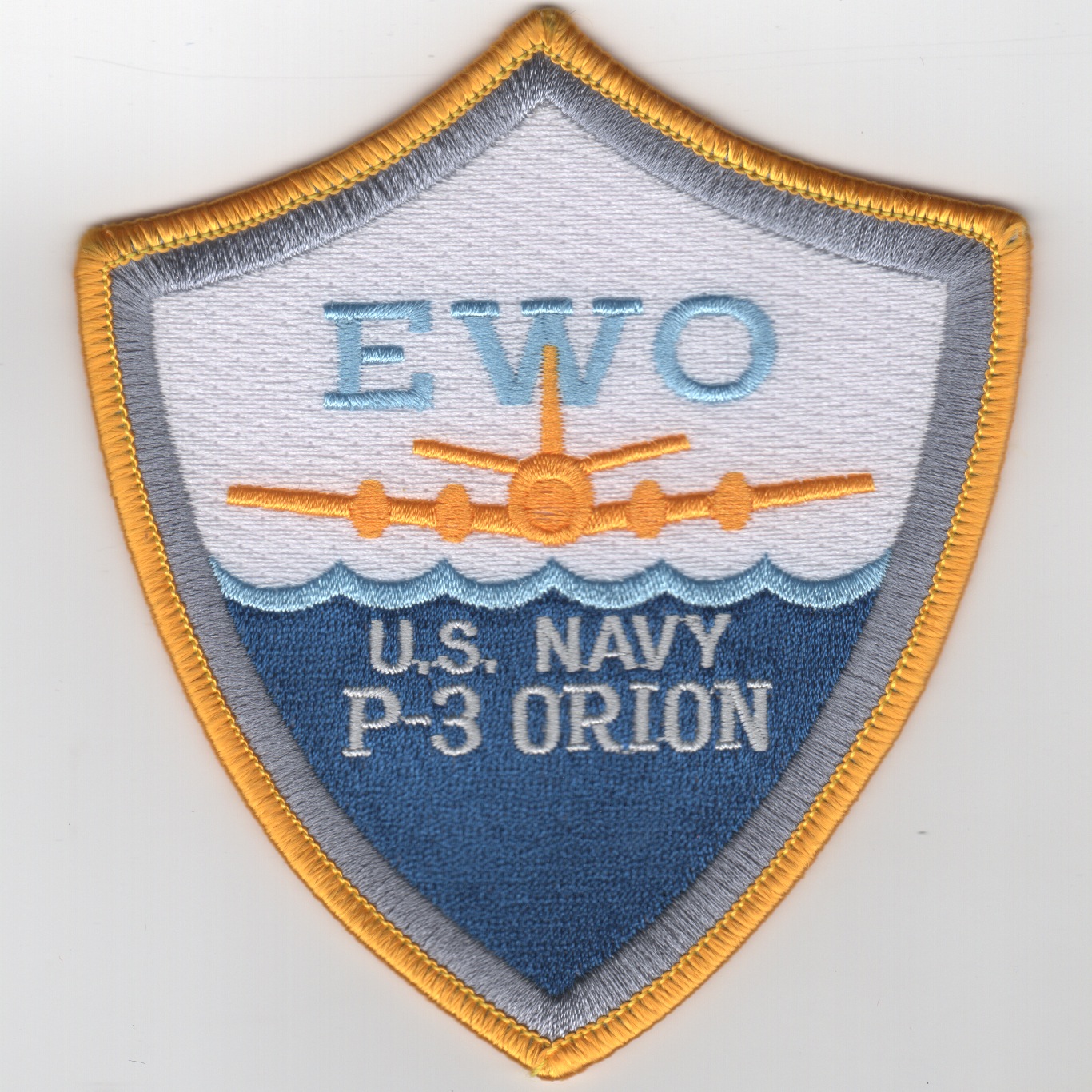 This is the patch worn on the flight suit sleeves for the P-3C Electronic Warfare Officers (EWO) showing the gold P-3 over the ocean. This patch does not come with velcro attached.