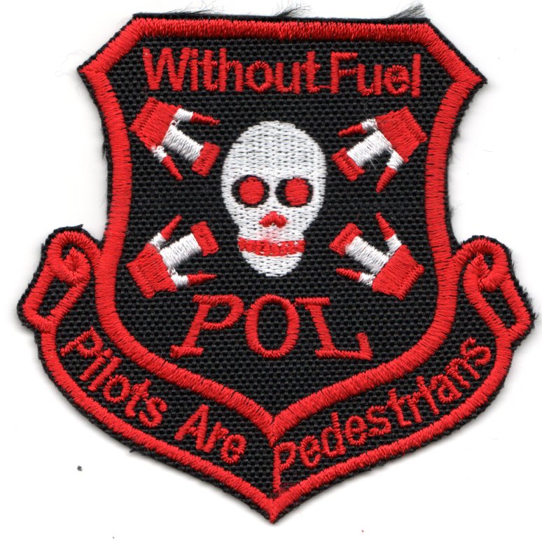 This is one of the patches found in the small Korean factory. It states “WITHOUT FUEL” (top), “POL” (middle), and “PILOTS ARE PEDESTRIANS” (bottom). It shows a skull with multiple hose nozzles pointed away from it, not sure if that means he’s “giving”. This patch does not have velcro.