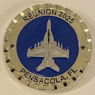 This is the front of the coin created by the P-G-A for the 2025 reunion in Pensacola, FL. it depicts the planform of the EA-18G with blue enamel (USN).