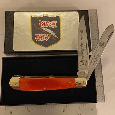 (Another AV8RSTUFF Creation for the River Rat ‘STORE’): This is the customized pocket knife created for the Red River Valley Association (Blade 1) and the Air Warrior Courage Foundation (Blade 2)…It has a red, bone handle with the logos of each organization on each blade. It comes in a black box with the RRVA logo on the outside AND since we only received TEN in this color, they are numbered 141 – 150 on the handle. Since they are “one-of”, first to ask for a particular number gets it.
