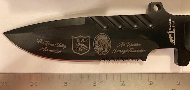 (Another AV8RSTUFF Creation for the River Rat ‘STORE’): This is the customized ‘BOOT-KNIFE’ created for the RRVA / AWCF. It comes with a black, nylon sheath with strap and place to hold a sharpening stone. You can see the customization of the blade below.