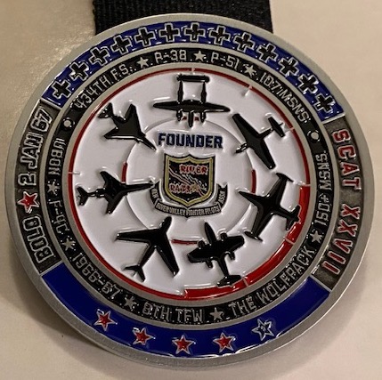 This is the commemorative coin for one (of three) of our Founders, B/GEN Robin Olds. The front shows a picture of him in the cockpit and comes in a protectecive, clear plastic case. This is the ‘front’ view of the coin, the ‘backside’ of the coin can be seen below. This is the commemorative coin for one (of three) of our Founders, B/GEN Robin Olds. The back shows a “gaggle” of aircraft, has his callsign, and says “FOUNDER”. It comes in a protectecive, clear plastic case. This is the ‘back’ view of the coin, the ‘front’ of the coin can be seen above.