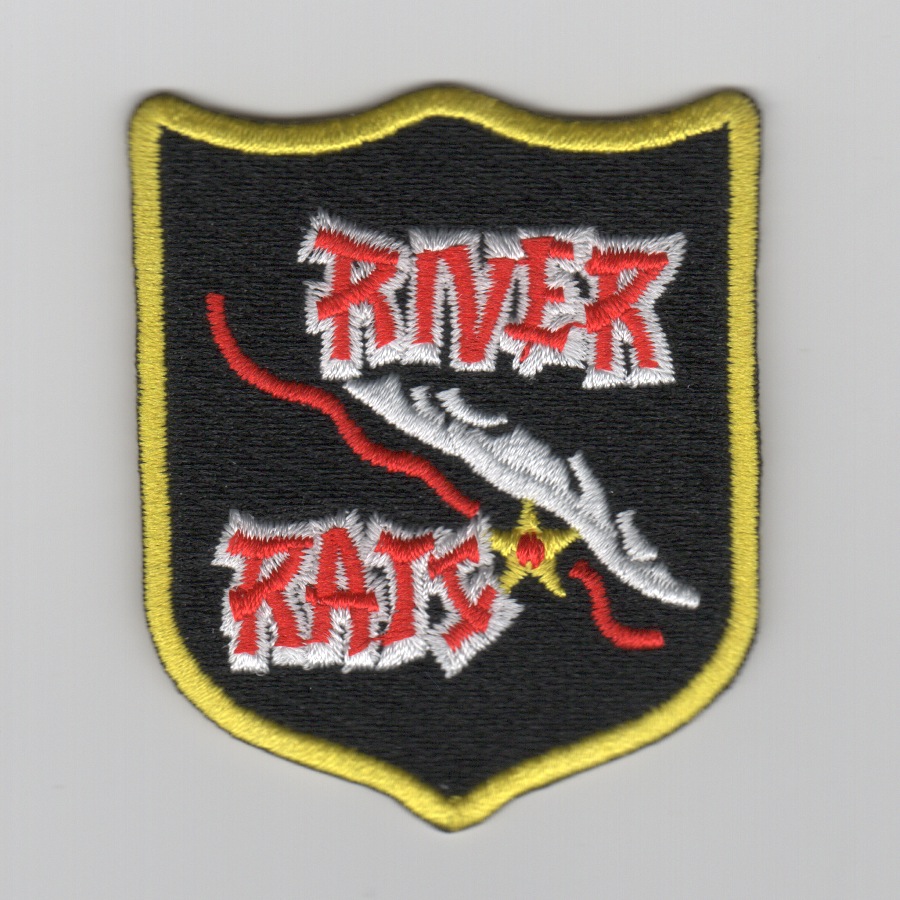 This is the small version of the “”””Official”””” Red River Valley Association Logo SHIELD Patch. It is the FAMOUS RRVA LOGO. It is shield shaped with the words “”””RIVER RATS”””” on it and does NOT have velcro attached.