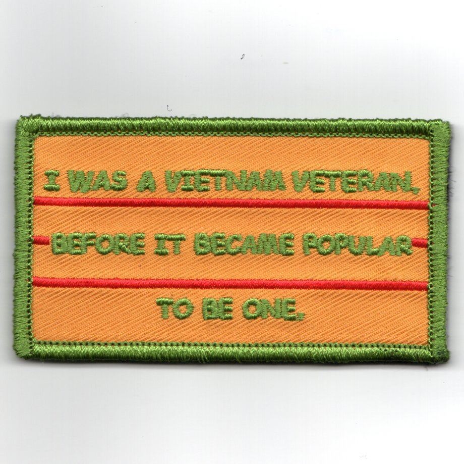 This is the “”””flag-shaped”””” rectangular patch in the Vietnam Ribbon colors that says “”””I WAS A VIETNAM VETERAN BEFORE IT BECAME POPULAR TO BE ONE””””. This patch does have velcro attached.