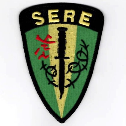 This is one of the other U.S. Navy SERE patches. SERE are the survival specialists that teach pilots and crew to survive in case that type of situation arises. The patch is the “”””shield-shaped”””” version with the letters SERE across the top. This version has the K-Bar knife and Barbed-Wire with the Vietnam Campaign colors of green-yellow. This patch does not have velcro attached.