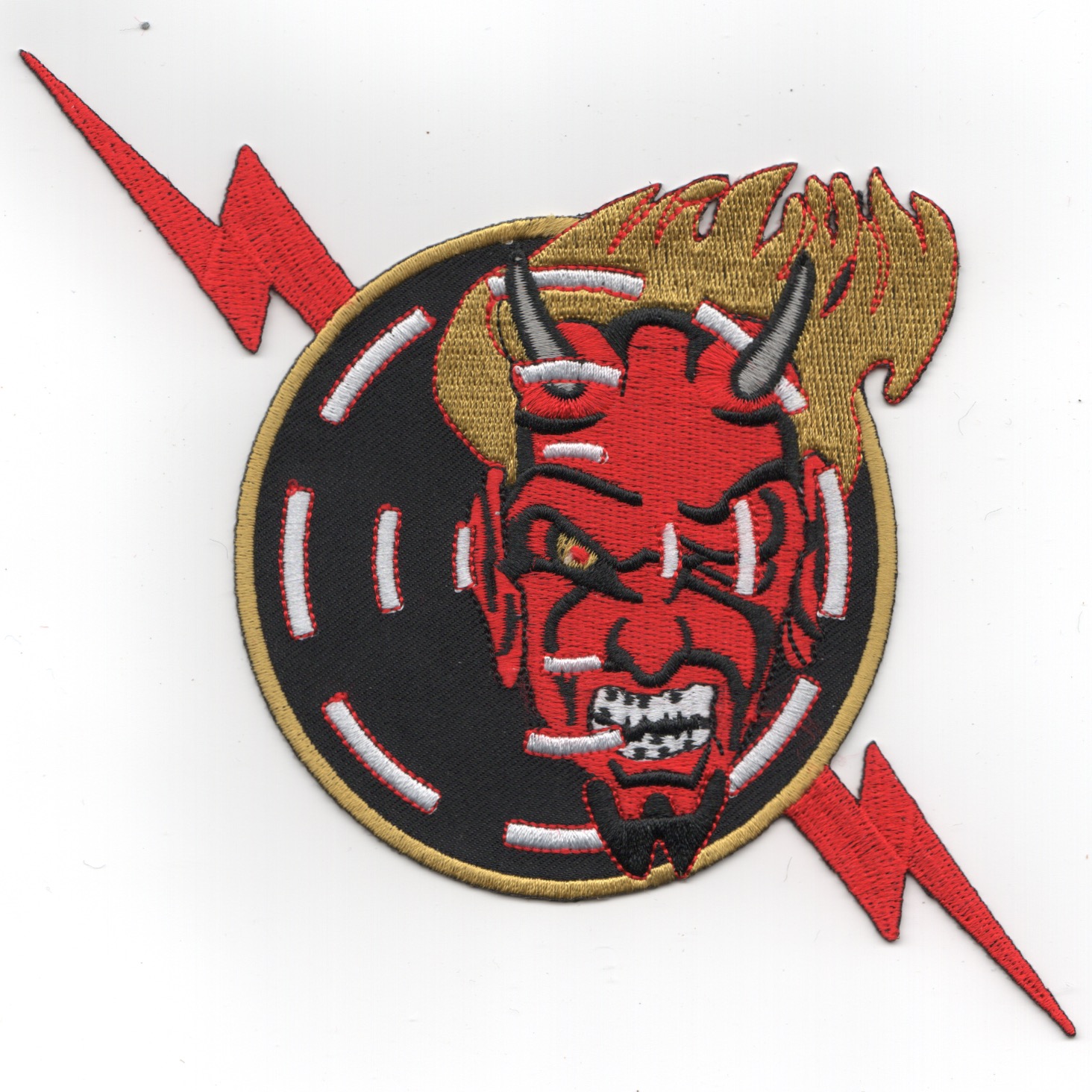 This is the ‘lightning bolt’ BACKPATCH version of the squadron patch for the Strike Fighter Weapons School, Atlantic for the F/A-18 Hornet and the F-14 Tomcat located at NAS Oceana, VA. When the schools combined, the officers got together to brainstorm a new design and arrived at this design of the “Devils Head”. Being that they fly aggressor missions for the fleet we are in a sense the Devil’s advocates. We “argue” the opposite side of a point to prove it’s validity. With that motto accepted the FA-18 officers wanted to preserve the F-14 heritage in the new school since the Strike Fighter name was staying and the F-14 is slowly being decommissioned. The obvious choice was the decommissioned F-14 squadron, VF-74 Bedevilers. With a redesigned Devil and replacing the old bomb site with the missle site from the “Top Gun” Fighter Weapons School design the new patch was formed. This BACKPATCH does not have velcro attached, as it’s meant to sew onto the back of a flight jacket!