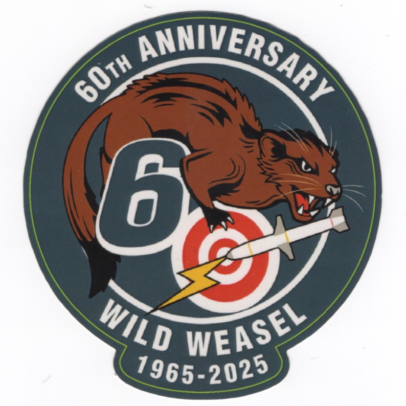 This is the dark gray version of the 60th Anniversary ZAP/Sticker created for the Society of Wild Weasels. It has the dates of 1965-2025 and shows the “WEASEL” above the “6-0” (bullseye).