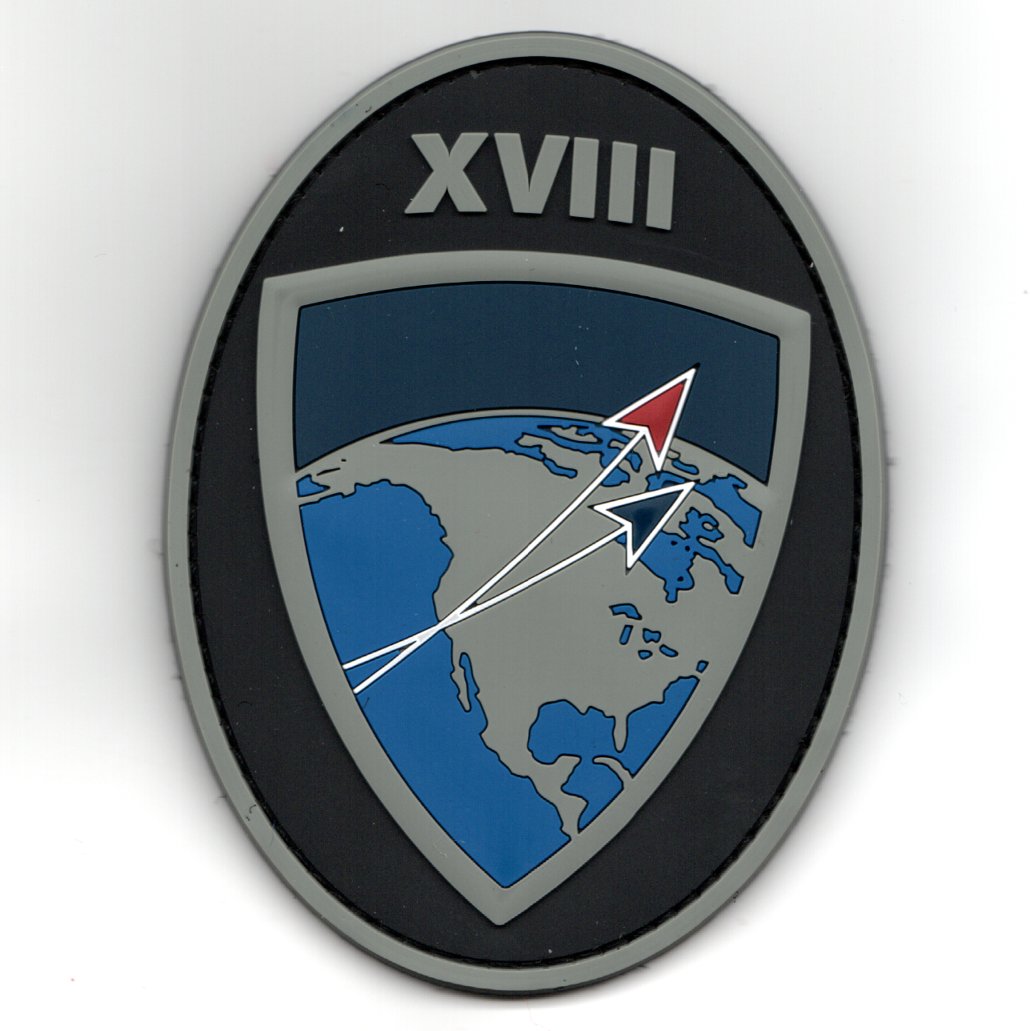 (Another AV8RSTUFF Creation): Space Command’s mission is: “To conduct operations in, from, and through space to deter conflict, and if necessary, defeat aggression, deliver space combat power for the Joint/Combined force, and defend U.S. vital interests with allies and partners. This patch says “XVIII” (top) and shows two spacecraft (one red, one blue) with a ‘Shield’ on the oval, is made out of PVC, and DOES have velcro attached.