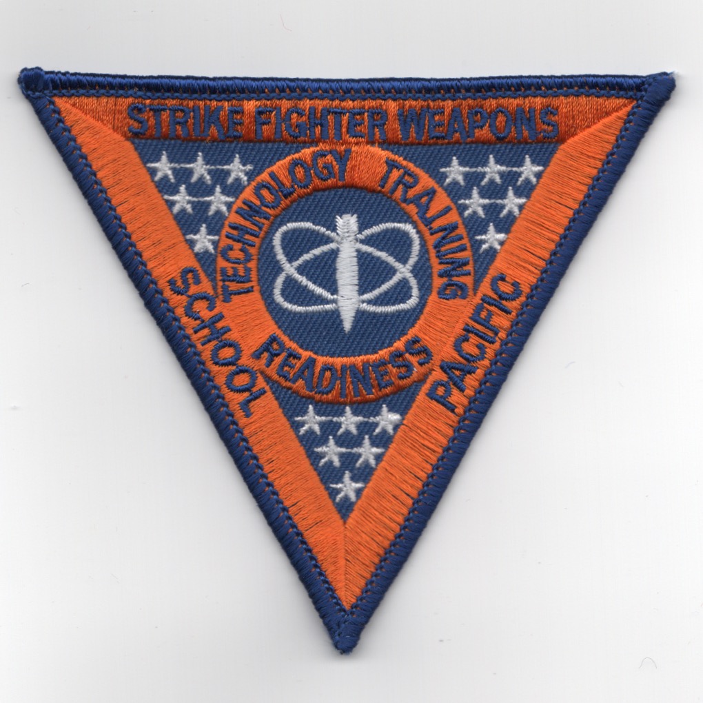This is the orange version of the squadron patch for the F/A-18 Hornet’s Strike Fighter Weapons School – Pacific. This school is located at NAS Lemoore, CA, and is the “West Coast equivalent” of the SWATSLANT school for the “Atlantic Fleet”. This version shows has the “ATOMIC RINGS” in the center of the triangle with a MK-82 and does not come with velcro attached.