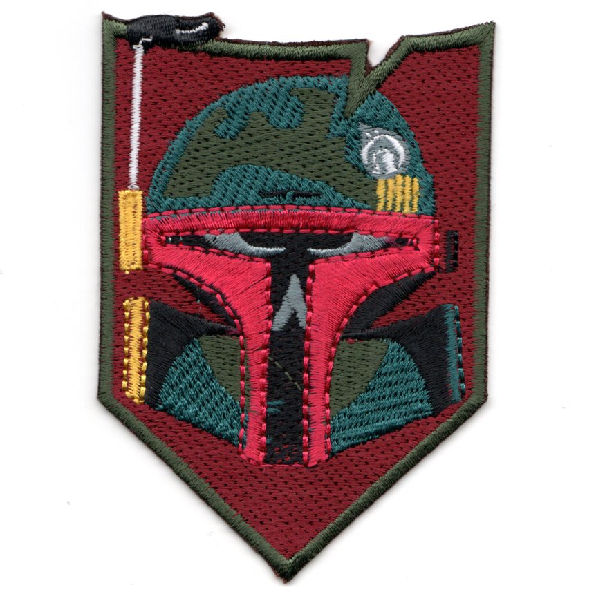 This is one of the MANDALORIAN patches I picked up in a collection from a guy who was as big a fan as I am (and you probably are, as well). This is the shield-shaped version of Boba Fett’s helmet on a maroon background. This patch does not have velcro attached.