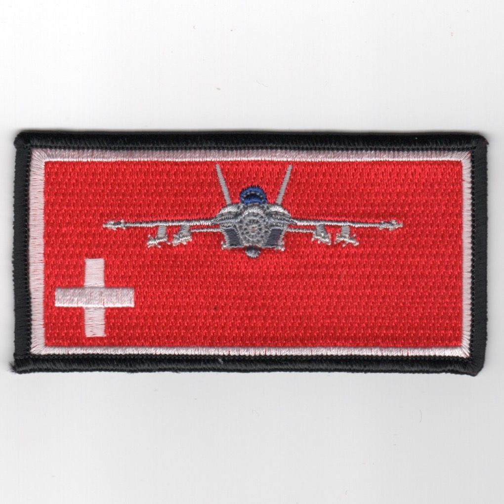 The Boeing F/A-18 ‘Test/Demo’ Team created this nametag for the SWISS aviators that will be flying the F/A-18 that the USA sells them. It depicts the front view of the F/A-18E (or /F) and can be embroidered (costs $5 more), if you want.