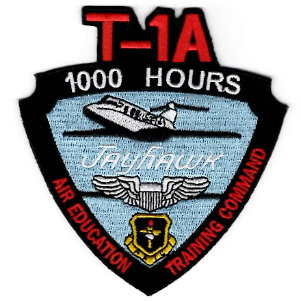 The Raytheon T-1 Jayhawk is a twin-engined jet aircraft used by the US Air Force for advanced pilot training. T-1A students go on to fly airlift and tanker aircraft. The T-400 is a similar version for the Japan Air Self-Defense Force. This patch commemorates those who log 1000+ hours in this aircraft and does not come with Velcro.