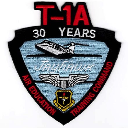 The Raytheon T-1 Jayhawk is a twin-engined jet aircraft used by the US Air Force for advanced pilot training. T-1A students go on to fly airlift and tanker aircraft. The T-400 is a similar version for the Japan Air Self-Defense Force. This patch commemorates the 30+ YEAR service of the JAYHAWK and does not come with Velcro.